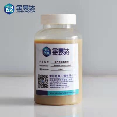 JH-611, stiren, akrilat ve polimerler ile özel üretim süreci ile ko-polimerize edilen bir tür etkili katyonik stiren akrilik emülsiyondur.Nişasta ile etkili bir şekilde eşleştirilebilir ve nişasta tabakasının çapraz bağlanma mukavemeti ve hidrofobiklikte daha iyi performans göstermesini sağlar. , daha düşük maliyetli, daha iyi yüzey boyutlandırma etkisi ve rahatlığı JH-611'in temel özellikleridir. boyutlandırma ajanlar vardır yaygın olarak Kullanılmış -e sağlamak Su direnci ve önlemek kağıt itibaren Bulanıklaştırma ile Su veya mürekkep. Bunlar ajanlar vardır uygulamalı bir geniş Çeşitlilik nın-nin kağıt / kağıt yazı tahtası (yazı kağıt, kopyalama kağıt, oluklu yazı tahtası, gazete, kartpostal, kağıt Fincan, kağıt sırt çantası, ve yani açık).